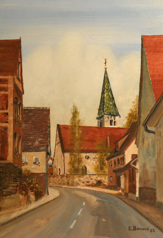 Kusterdingen – Hindenburgstraße – Marienkirche, 1983 (ÖL/Holz, 40 x 50 cm)