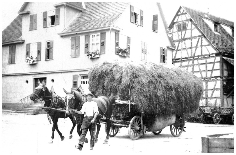 Am Pfarrhaus und der Zehntscheuer vorbei, bringt der damalige Bürgermeister von Wankheim, Jakob Walker, etwa 1935 seinen hochbeladenen Erntewagen nach Hause. Zwei Pferde ziehen den Leiterwagen, an dem auch die seitlichen Tücher prall gefüllt sind. Auf dem hinteren Wagenbrett fährt noch eine Person mit.