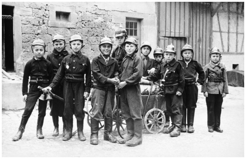 Bereit für den Festzug für das erste Kinderfest nach dem zweiten Weltkrieg anfangs der fünfziger Jahre standen diese Kusterdinger Burschen vor der noch nicht umgebauten Ölmühle in der Kirchentellinsfurter Straße. Ausgerüstet mit Helm und Koppel der »Großen« Feuerwehr, selbst organisiert wurden Löschwagen, Fass, Schlauch und Pumpe, Glocken und Trompete, Bekleidung und Stiefel.