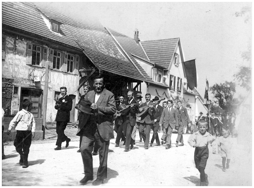 In den zwanziger Jahren marschierte in dem Festzug in Jettenburg eine kleine Gruppe mit Blas- und Zupfinstrumenten, die später die Keimzelle des Musikvereins bildete. Der Träger mit dem Namensschild dieses Vereins ist fast aus dem Bild verschwunden, nur der Schatten des Schildes ist noch sichtbar. Schön geschmückt mit Girlanden und Fahne ist das Gasthaus zum Ochsen.