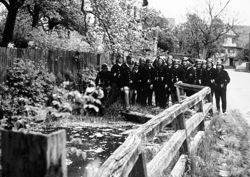 Die Feuerwehr Immenhausen 1965 an der Wette in der Härtenstraße (Hauptstraße). Feuerwehren waren schon immer wichtige Einrichtungen im Dorf. Wasser war existenziell. In vielen Dörfern richtete man einen Feuerteich ein, die Wette, die hier von den Feuerwehrmännern (und zwei listigen Burschen hinter dem Zaun) begutachtet wurde. Im Hintergrund ist die Brunnensäule des oberen Brunnens zu erkennen. Brach ein Feuer aus, was ursprünglich durch laute Hornstöße mit dem gleichzeitigen Ruf »Feuerio« angezeigt wurde, musste laut württembergischer Feuerordnung von 1752 jeder mit Kübeln und Wannen zum Brandherd eilen. Alle Gemeinden des Königreichs Württemberg wurden dann 1883 verpflichtet eine Feuerwehr zu gründen und die Kosten für Uniform und Ausrüstung zu übernehmen. Jeder Bürger zwischen 22 und 45 war automatisch Mitglied der Feuerwehr. Noch vor dem Ersten Weltkrieg hat man diese in eine freiwillige Feuerwehr umgewandelt.