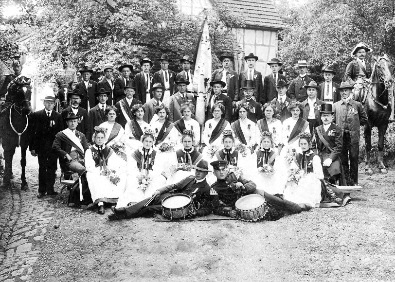 Fahnenweihe des Turnvereins Mähringen am 1. Juni 1913. Turnerinnen und Turner präsentieren sich in kunstvoller Aufstellung in der Raihingstraße anlässlich der Fahnenweihe. Vorne Trommler, dahinter die Frauen in Tracht und als Festdamen mit Eichenlaubkränzen; die Männer teils mit Gehrock und Zylinder, teils mit Anzug, und die Aktiven mit der weißen, langen Turnerhose und Jacket, alle jedoch mit dem Hut als bürgerlichem Statussymbol. Festbändel und Schärpe sind Zeichen der Zugehörigkeit. Auch in Mähringen fasste die Idee von Turnvater Jahn Fuß. Unter Sport verstand man vor dem Ersten Weltkrieg zuallererst das Turnen. Auf dem Turnplatz wurde bei jedem Wetter geturnt. Besonders wichtig war die von den Frauen kunstvoll gestickte Fahne, ein altes Symbol der Identität mit einer Gemeinschaft, einer Herrschaft oder einer Sache; deshalb galten Weihe und Gelöbnis als Zeichen der Treue.