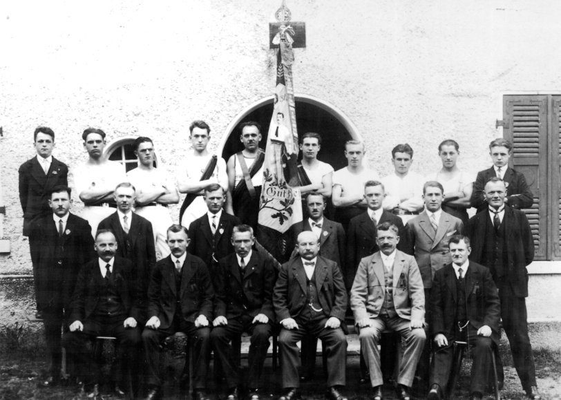Der Arbeiterturnverein Jettenburg bei seinem 25jährigen Jubiläum am 24. August 1930. Vor dem Jettenburger Rathaus haben sich selbstbewusst Gründungsmitglieder, passive und aktive Turner – ohne Frauen – aufgereiht. Die Fahne zeigt Ferdinand Lassalle (1825-64), der 1863 den Allgemeinen Deutschen Arbeiterverein – einen Vorgänger der SPD – gegründet hat. Unter der Abbildung der Turnergruß »Gut Heil« im Eichenlaub. Die Männer tragen keine Hüte, die aktiven in Turneranzügen. Viele Jettenburger gingen jeden Tag zu Fuß zur Arbeit in die Reutlinger Fabriken. Da den »Fabriklern« die Aufnahme in die bürgerlichen Vereine oftmals erschwert wurde, gründeten sie – da sie ja eine geregelte Freizeit hatten – einen Arbeiterturnverein als Alternative zur bürgerlichen Vereinskultur.