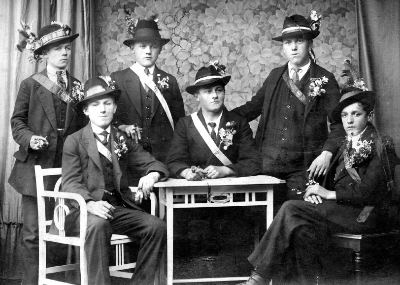 Rekruten aus Jettenburg Ende des Ersten Weltkriegs im Fotoatelier. Nach der Musterung hat man sich die Schärpe der Waffengattung umgehängt. Man feierte im besten »Sonntagsstaat« blumengeschmückt den »Abschied von der Jugend«. Mit der Rekrutierung hat diese endgültig ihr Ende gefunden. Der bittere Ernst beginnt. Jetzt werden den jungen Menschen Status, Rollen und Funktionen eines Erwachsenen vollständig zuerkannt, und das galt für alle Männer, aus welcher sozialen Schicht sie auch stammten. Die Gesichter spiegeln die gespannten Erwartungen, vielleicht auch eine gewisse Furcht wider. – Was wohl auf diese sechs Jettenburger Rekruten zukam?