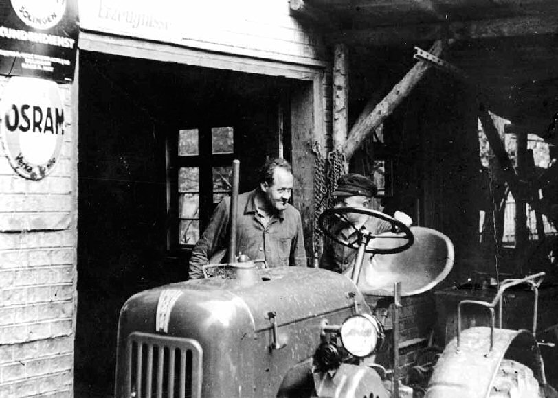 Der “Schmied-Serg” (Georg Mozer, gestorben 1973) vor seiner Schlepperwerkstatt in der heutigen Emil-Martin-Straße in Kusterdingen. Georg Mozer war auch Interimskommandant der Feuerwehr während des Zweiten Weltkriegs. Der Schmied gehörte zu den wichtigsten Handwerkern im Dorf; neben der Ausübung seines Handwerks vertrieb und reparierte er später Werkzeuge, Gebrauchsartikel wie Glühbirnen und landwirtschaftliche Geräte aller Art, mit der Motorisierung natürlich vor allem Schlepper. Als ursprünglicher Hersteller von Waffen, Werkzeugen und Hufeisen gehörten die Schmiede zunftmäßig zu den “großen” Handwerken. Der Schmied genoss seit dem Mittelalter Sonderrechte und hatte eine Ausnahmestellung in der Gemeinde. Hufschmiede beschlugen Pferde, Wagen und das zum Fuhrwerk nötige Geschirr; sie durften unter Umständen auch am Sonntag arbeiten, wenn ein liegen gebliebenes Fahrzeug wieder flott zu machen war. Waffenschmiede fertigten auch Äxte, Hauen, “Bickel”, Sensen usw. Das Schmieden und Umgehen mit Feuer und Eisen musste gekonnt sein.