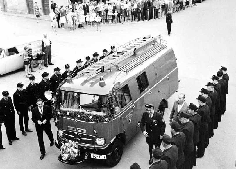 Übergabe des ersten Kusterdinger Feuerwehrautos LF 8 am 24. Juni 1963 an die Feuerwehr. Schon im Jahr 1961 hatte die Feuerwehr den Antrag an den Gemeinderat gestellt, die Gerätschaften zu modernisieren. So wurde 1962 beschlossen, ein Löschfahrzeug und endlich neue Uniformen mit “Hemd und Krawatte” anzuschaffen. Im Juni fuhr dann Bürgermeister Gerhard Kindler mit einer Feuerwehrabordnung nach Karlsruhe, um das erste Kusterdinger Löschfahrzeug auf dem Hof der Firma Metz entgegenzunehmen und bei der TÜV-Abnahme dabei zu sein. Im Bericht dazu heißt es: “Doch wer geglaubt hat, dass in ein oder zwei Stunden alles fertig wäre, wurde bald eines Besseren belehrt. Über den ganzen Tag zogen sich die Prüfungen hin und erst jetzt wurde manchem von uns Kusterdinger Feuerwehrmännern klar, welches kleine Wunderwerk wir da in Besitz bekommen, auf das wir wirklich stolz sein können”. Das Bild zeigt, wie Eugen Armbruster (Firma Seeger, Tübingen, im Bild links vor dem Fahrzeug) das LF 8 an Bürgermeister Gerhard Kindler (nicht im Bild) vor dem Rathaus übergibt. Die damals etwa 40 Mann starke Wehr ist komplett angetreten.