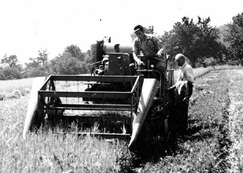 Der erste Mähdrescher von Mähringen, Baujahr 1955. Das Bild zeigt den Massey-Harris Mähdrescher Nr. 630 mit Anbaustrohpresse. Er wird gefahren von Walter Riehle (heute Ohmenhausen), als “Beifahrer” fungiert Georg Digel (Jettenburger Straße). – Mechanisierung, Intensivierung und Rationalisierung bestimmen heute die Arbeit unserer Landwirte. Landmaschinen sind im vorigen Jahrhundert an die Stelle menschlicher Arbeitskräfte getreten. Dennoch war es ein langer Weg vom einfachen Dreschflegel über die von Tieren gezogene Dreschwalze zur Stiften- und dann zur Schlagleistendreschmaschine und schließlich zum hochmodernen Mähdrescher. Vergleicht man die großen Mähdrescher, wenn sie uns auf dem Feld oder auf der Straße entgegen kommen, mit dem auf dem Bild dargestellten ersten Mähringer Mähdrescher, so wird einem die Entwicklung klar. Wer sich übrigens für alte Landmaschinen und Traktoren interessiert, kann diese im Landwirtschaftsmuseum der Universität Hohenheim besichtigen.