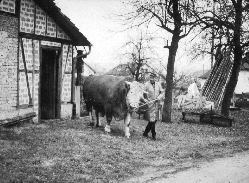 In dem vielfach geteilten Hof sehen wir von links nach rechts hintereinander angeordnet: zwei Scheuern, das gestelzte Einhaus (unter einem Dach Stall, Hausgang mit Treppe und darüber die Wohnung), ein weiteres gestelztes Einhaus mit einer für die wohlhabenderen Bauernhäuser auf den Härten hölzernen Außenstiege), im Hof ein Schopf (Backhaus oder Bauchhäusle). – In Württemberg herrschte schon immer der demokratische Zwang zur Realteilung: Alle Geschwister und sonstige Erben wurden gleichgestellt. Die Hinterlassenschaft eines Verstorbenen wurde ohne Rücksicht auf das Bestehen des Hofes in so viele Teile zerpflückt, wie Erben da waren. Die Erbakten unserer Dörfer zeigen deshalb absurde Besitzverhältnisse: Dass einer die Hälfte eines halben Hauses besitzt, ist fast nicht normal und der Betreffende ist reich zu nennen. Natürlich gehören die beiden Scheuern auf unserem Bild zu den beiden Wohnhäusern, der Hof ist gemeinsames Eigentum. Aber die Gebäude zeigen oft nicht, wie die Eigentumsverhältnisse wirklich waren und wie viele Parteien darin lebten. Drei Fünftel an einem doppelten Haus, ein Zehntel an einem halben, so steht es oft in den Akten. Wenn das ohne Streit abgegangen wäre, müssten auch die Einwohner unserer Dörfer Engel gewesen sein. Aber man war aufeinander angewiesen, man musste sich jeweils gütlich einigen.