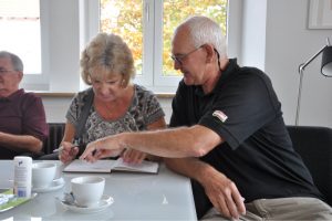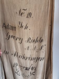 Gegen 14:00 Uhr machten wir uns dann auf den Weg in die Burgstraße, wo Siegfried und Ursula Riehle auf uns warteten. Sie hatten uns bereits im Vorfeld angeboten, das Haus zu zeigen in dem Johann Georg Riehle, seinerzeit mit seiner Familie gewohnt hatte. Da Sigi’s Vater einiges gesammelt hatte, war die Euphorie groß, als unter anderem die bedruckten Getreidesäcke an der Wand hingen. Sofort wurde gerätselt, welcher Sack wohl von welchem Vorfahren stammt. Bei der Namensgleichheit keine einfache Aufgabe.